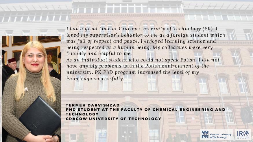 - Termeh Darvishzad, Iran – PhD student of the Faculty of Chemical Engineering and Technology